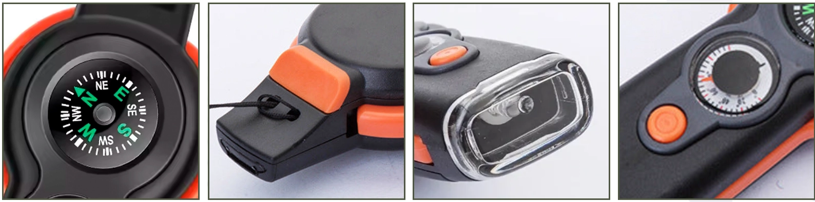- Tudo-em-Um para Qualquer Emergência. Num único objeto tens: apito, bússola, lanterna LED, termómetro e cordão de transporte, eliminando a necessidade de carregar vários acessórios separados.